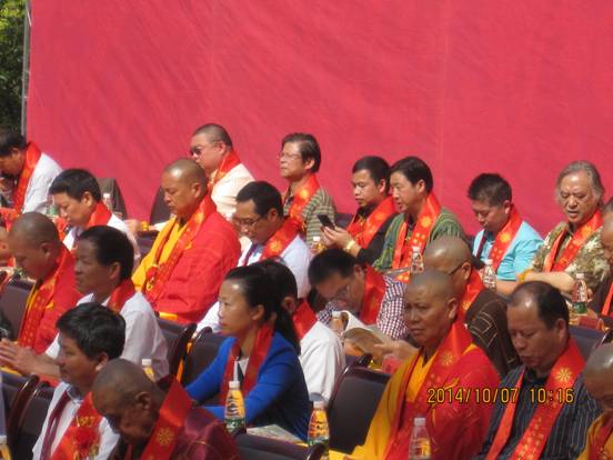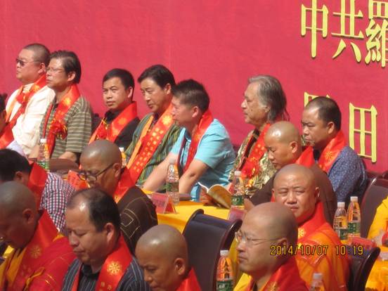 宋斌教授与中国著名书法家孔可立在庆典法会主席台上与大德高僧长