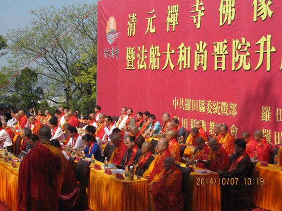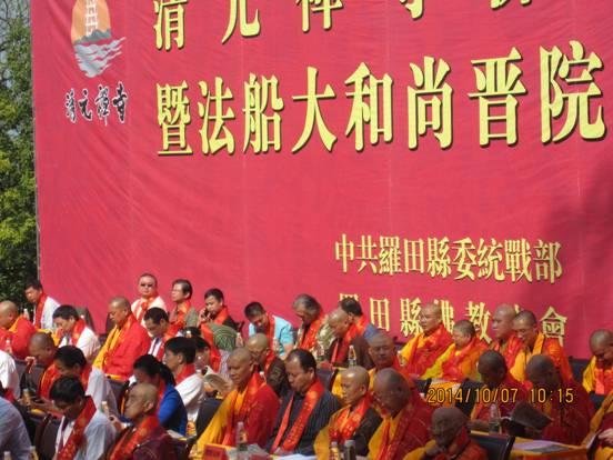 宋斌教授与中国著名书法家孔可立在庆典法会主席台上与大德高僧长老合影
